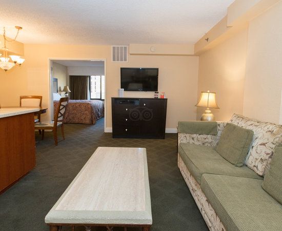 Maximum occupancy in each suite includes children regardless of their age. This suite has one bathroom with a hair dryer, separate living area, full kitchen including a microwave and stove, dining area, cable television, DVD player, and air-conditioning. Bed types are a king-size bed in the master bedroom and a queen-size sofa sleeper in the living area.