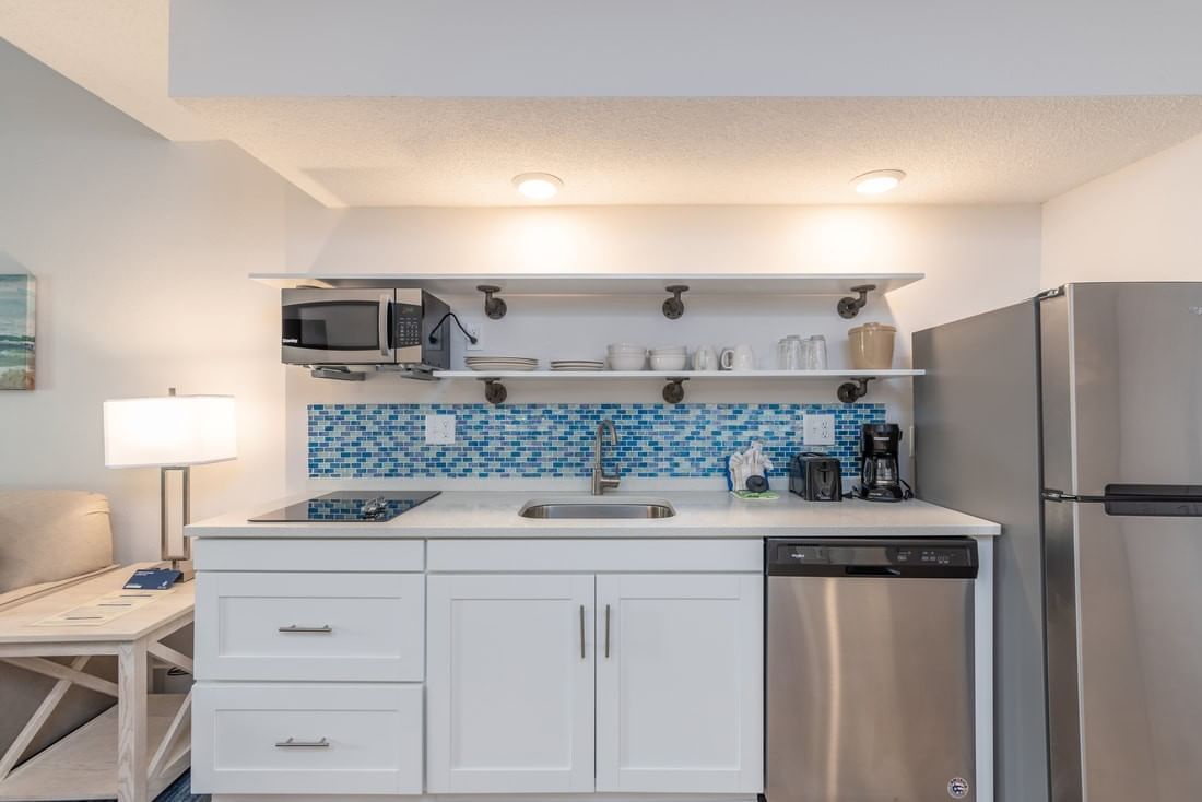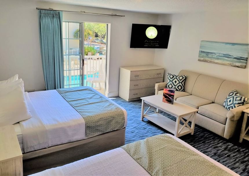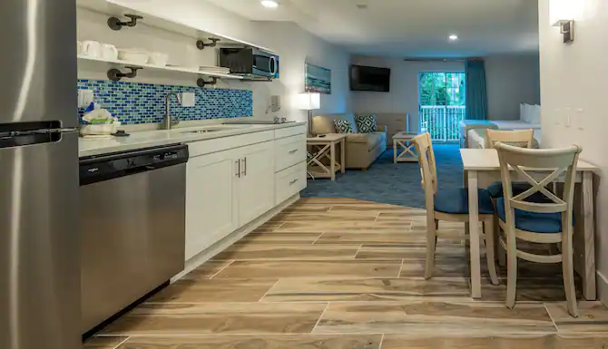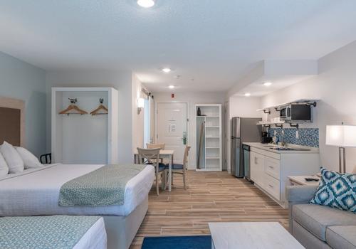With two comfy queen beds and a pullout sofa, our Queen Suites are perfect for a family of 4. Get some fresh air on your private balcony. All units include a full kitchen, complete with appliances, cookware, and dinnerware.