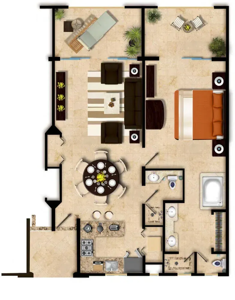 Welcome to our One Bedroom with Garden View! Book with us to escape to the Caribbean and embark on an enchanting getaway. This spacious 1152-square-foot suite features elegant décor with warm earthy tones punctuated by vibrant splashes of color to create a soothing atmosphere.