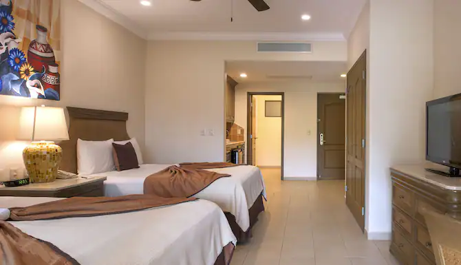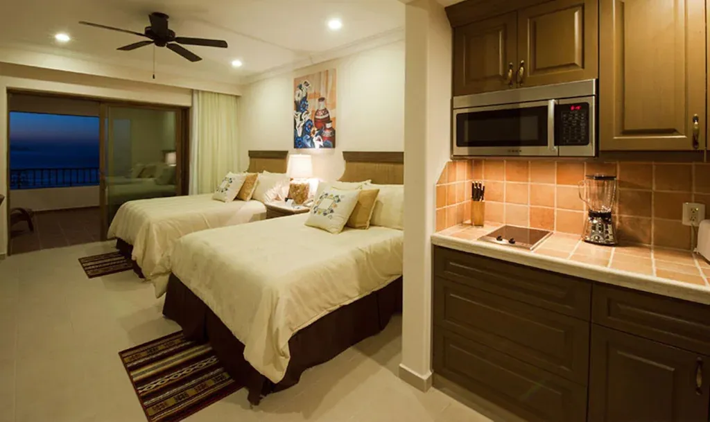 Our residential-style Deluxe Suite is larger than the size of a standard hotel room. The room includes two queen-size beds or one king-size bed (subject to availability), a spacious bathroom, an LCD TV, and a kitchenette complete with a two-burner stove, mini-fridge, coffee maker, blender, toaster, and a sufficient amount of dishes for everyone staying in the room! Every Deluxe Suite at Villa del Palmar at the Islands of Loreto has a large balcony that offers breathtaking views of the Sierra de la Giganta Mountain Range, TPC Danzante Bay, or the resort’s tropical gardens and pool deck. (Views are subject to availability)